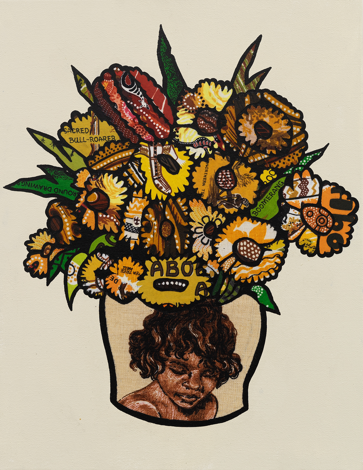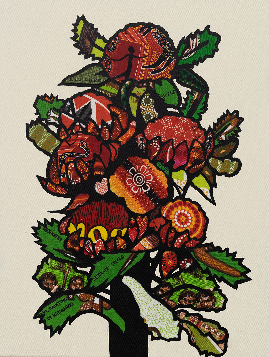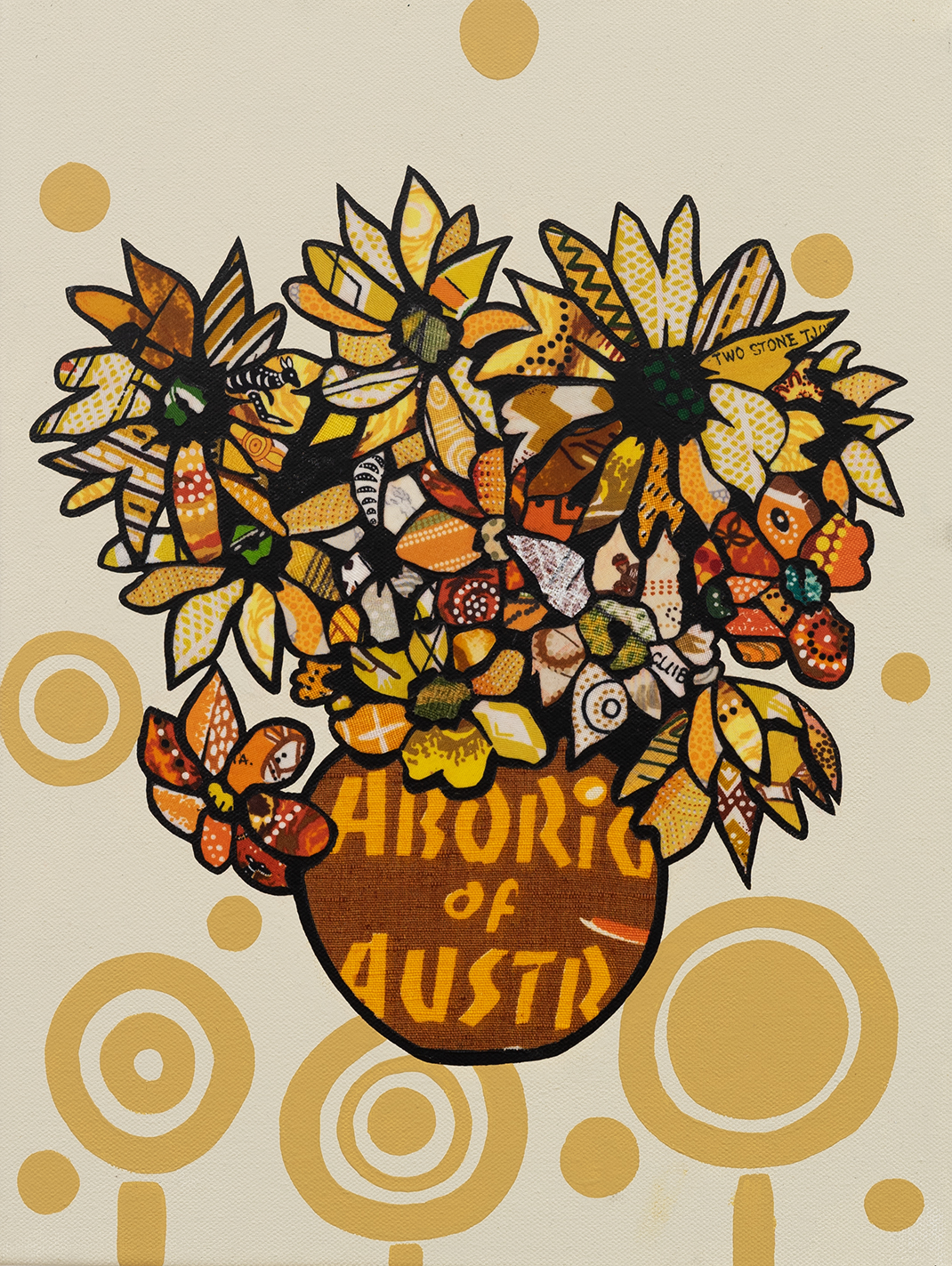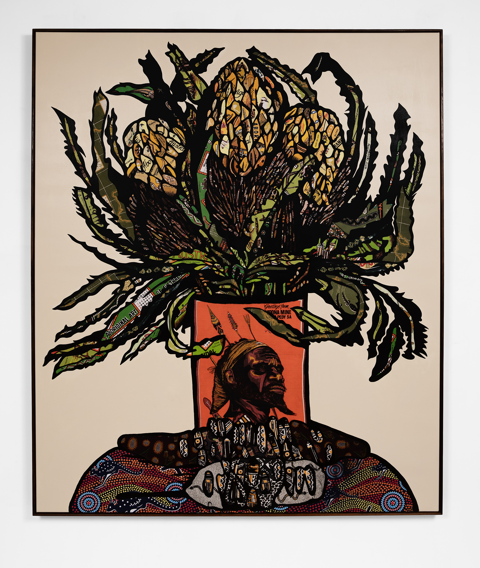 Reclamation (Waratahs), 2025 acrylic and vintage appropriated fabric on canvas 41 x 30.5cm