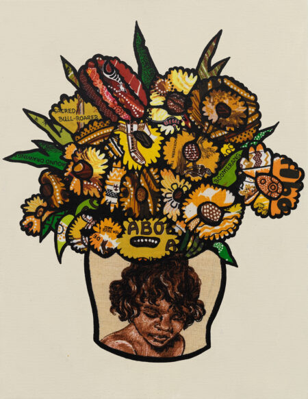Reclamation (Paper Daisies) , 2025 acrylic and vintage appropriated fabric on canvas 46 x 35.5cm