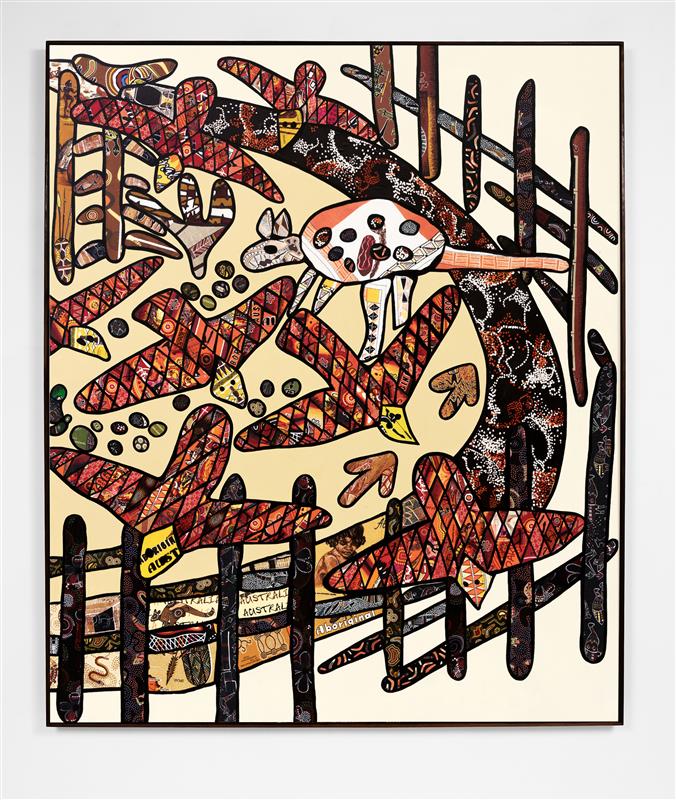 Unpacking History (Disconnect), 2024 acrylic and vintage appropriated fabric on canvas 185.5 x 155 cm